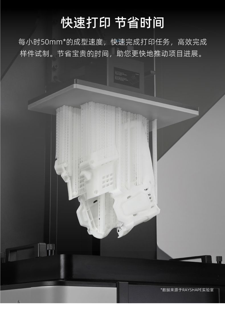 RAYSHAPEShape1+3D打印機采用的數(shù)字光處理技術(shù),能夠在同等打印質(zhì)量下,實現(xiàn)比傳統(tǒng)SLA3D打印機更快的打印速度。DLP3D打印機的投影光源可以同時照射整個打印層,而不像SLA3D打印機那樣單點逐行掃描,這樣就能夠快速地固化大面積的光敏樹脂,從而大幅提高打印速度。