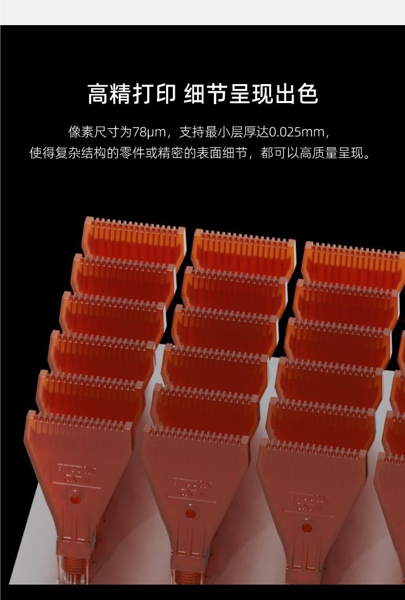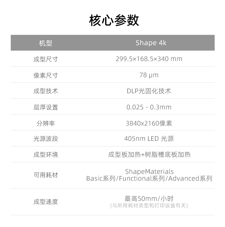 Shape 4K像素尺寸為78um,支持最小層厚達0.025mm,使得復(fù)雜結(jié)構(gòu)的零件或精密的表面細節(jié),都可以高質(zhì)量呈現(xiàn)。