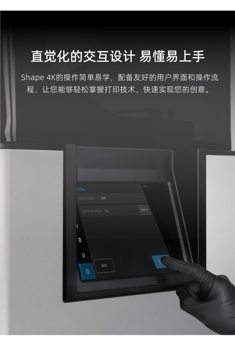shape 4K配備了樹脂液位檢測功能,可以在缺料時暫停打印并提醒用戶,加料后繼續(xù)打印,從而保證打印過程的連續(xù)性和穩(wěn)定性。
