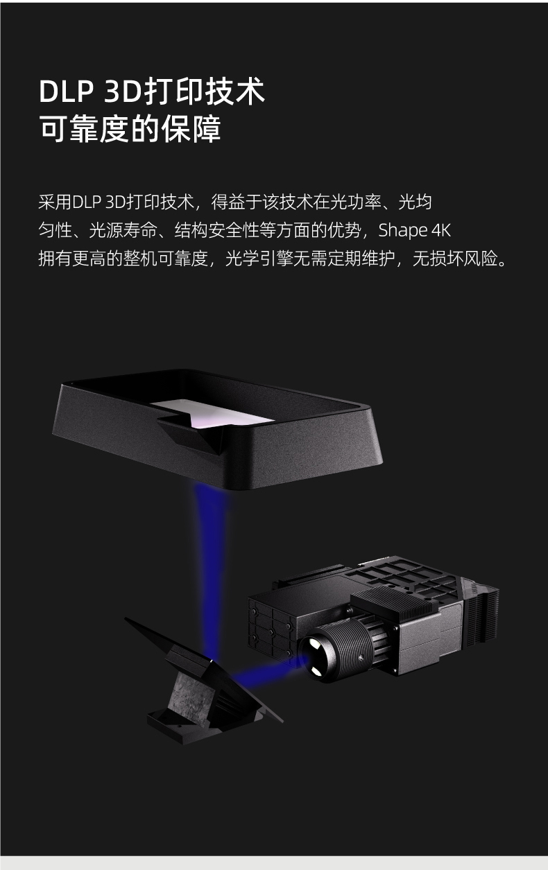 shape 4K采用DLP 3D打印技術(shù),得益于該技術(shù)在光功率、光均勻性、光源壽命、結(jié)構(gòu)安全性等方面的優(yōu)勢,shape 4K擁有更高的整機可靠度,光學(xué)引擎無需定期維護,無損壞風(fēng)險。