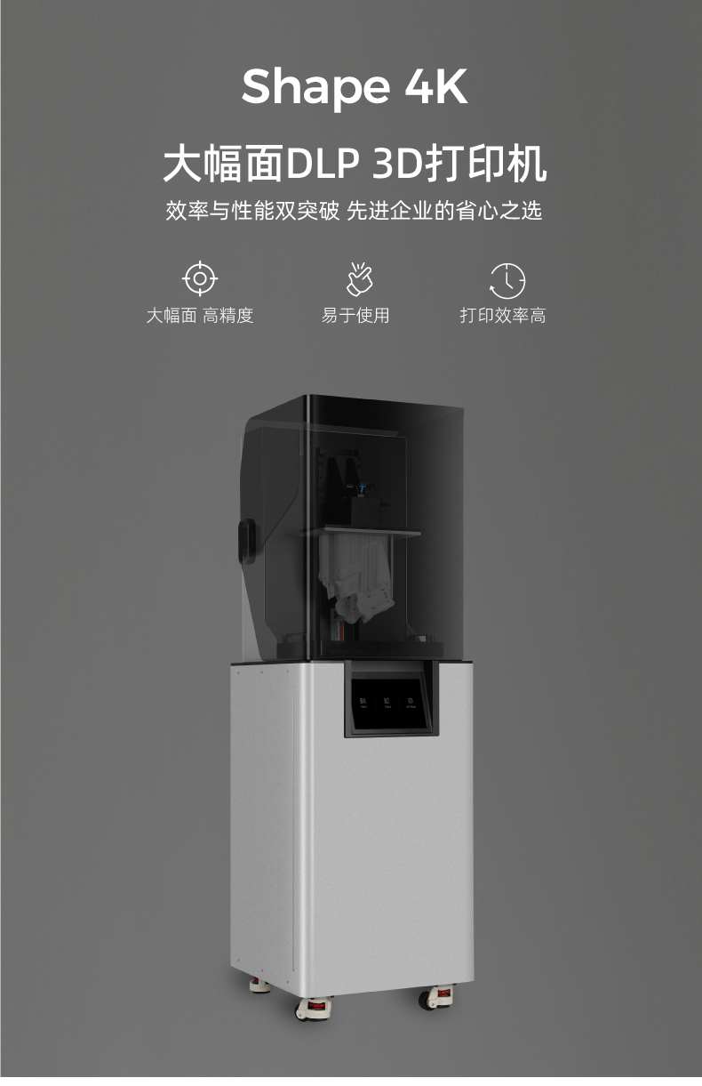 Shape 4K大幅面DLP3D打印機效率與性能雙突破,先進企業(yè)的省心之選,更大尺寸,更高精度,405mm光源4k光機帶來高達0.075mm的超高精度,更支持光斑自定。最高打印速度可達50mm/小時,5倍高速于其他同類型產(chǎn)品。