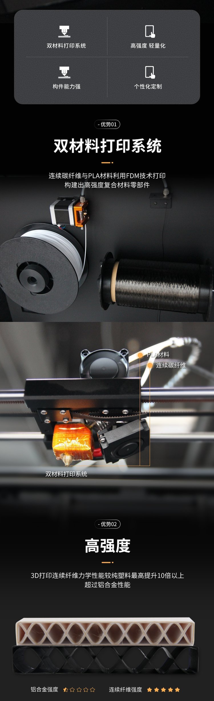 Combot 200連續(xù)碳纖維3D打印機(jī)具備雙材料打印系統(tǒng),支持PLA、復(fù)合碳纖維、凱拉夫纖維、玻璃纖維、PEEK等高性能耗材,在打印尺寸成型質(zhì)量方面都有著巨大優(yōu)勢,雙材料打印系統(tǒng)可以最大限度保持構(gòu)件高強(qiáng)度的同時,減輕構(gòu)件重量,為后期材料驗證,板件制作,強(qiáng)度增強(qiáng),物體減重,科學(xué)研究提供便利。
