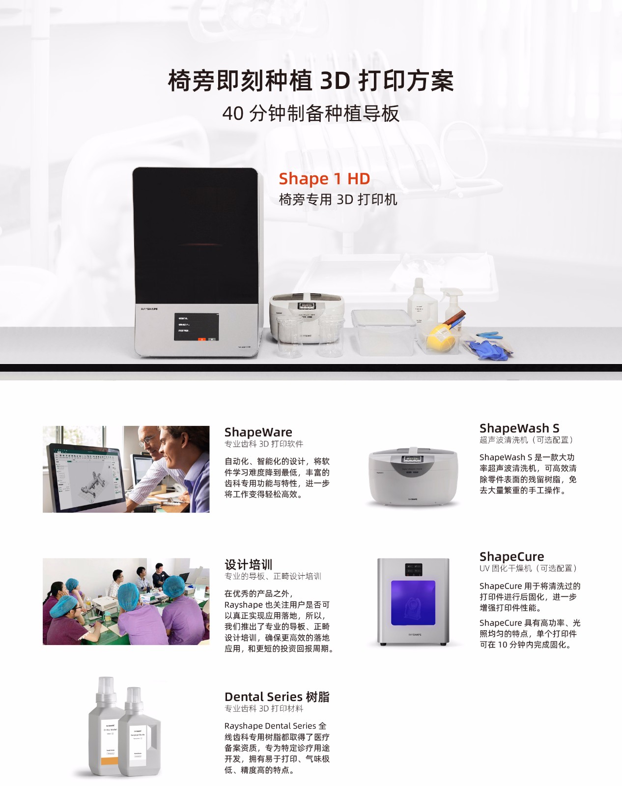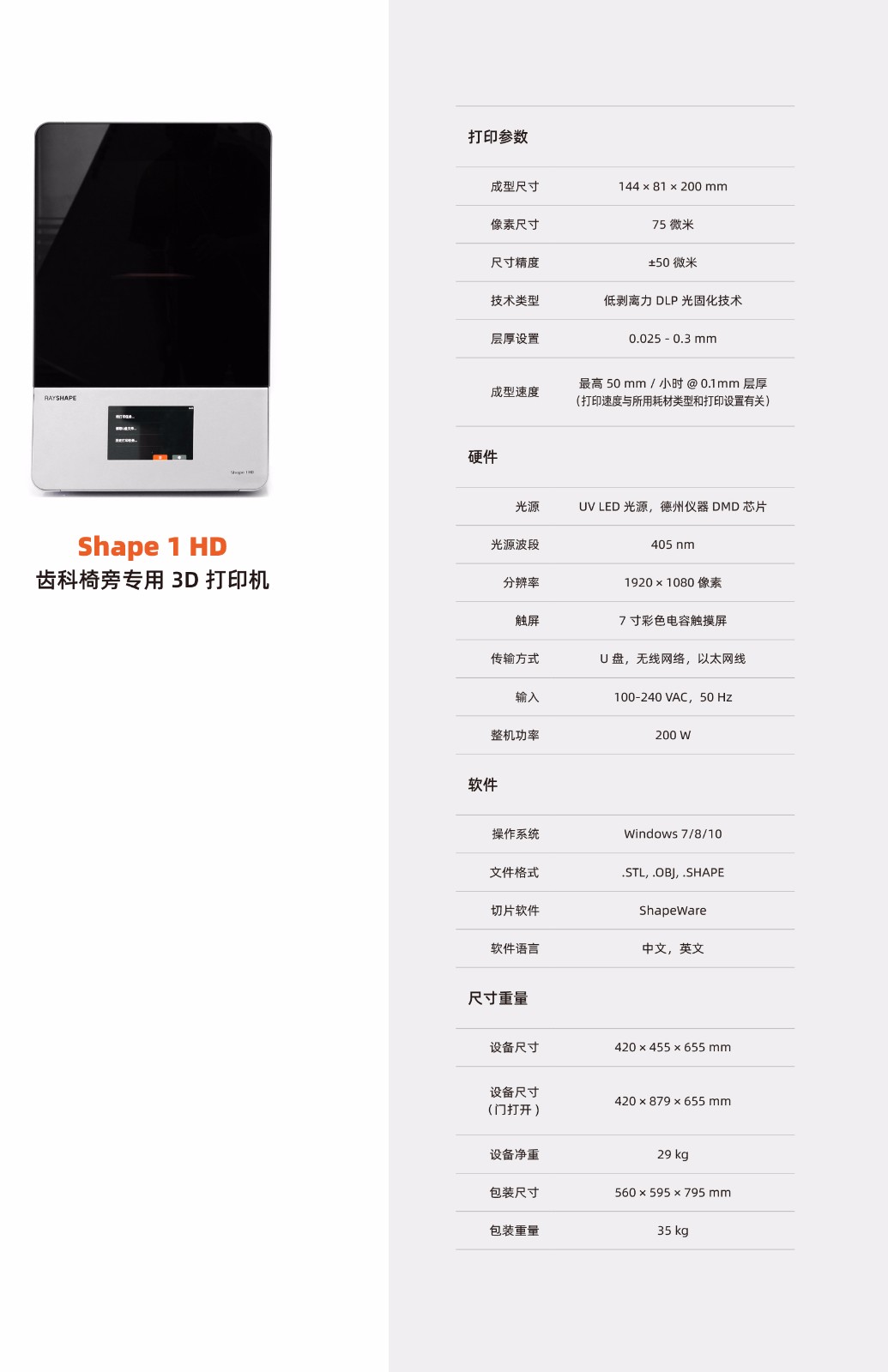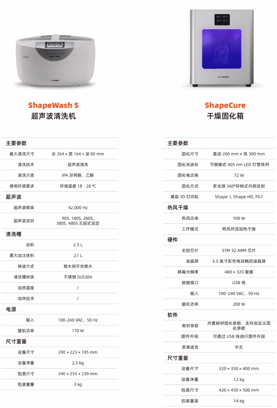 Shape 1系列3D打印機創新地將高速剝離技術與 DLP 數字面投影技術結合,使得 Shape 1 系列可以達到 50mm 高度 / 小時 * 的打印速度, 這意味著,單次同時打印多個 10cm 高的零件,最短只需要 2 小時。原廠三個系列共 20 款高性能光敏樹脂,且開放對第三方材料的支持可靠性與安全性并重辦公場景中使用的 3D 打印機產品,需要完善的設計ShapeMaterials 耗材體系涵蓋了 Basic、Functional、Dental 三個系列,可以滿足從概念原型、功能原型、模具、終端部件、醫療、文創、批產等多行業、多應用的需求。恒溫打印倉Rayshape 全系列產品皆配備恒溫打印倉技術,確保任何氣溫環境下光敏樹脂都能維持在最佳的粘度,避免因氣溫過低造成打印失敗。空氣凈化Rayshape 全系列 3D 打印機皆配備 HEPA 空氣凈化系統,降低氣味,減少光敏樹脂對工作環境的影響。安全門設計打印過程中若打開倉門,打印機會立即暫停打印,最大限度降低運動部件或激光對人造成傷害的潛在風險。Basic 系列包含標準黑、標準灰、標準白、精密、高速,共 5 款光敏樹脂Functional 系列包含韌性、剛性、耐磨、耐高溫、類硅膠、類橡膠、阻燃、防靜電、高透明、紅蠟,共 10 款光敏樹脂Dental 系列包含牙模、手術導板、正畸模、假牙齦、記存模,共 5 款光敏樹脂