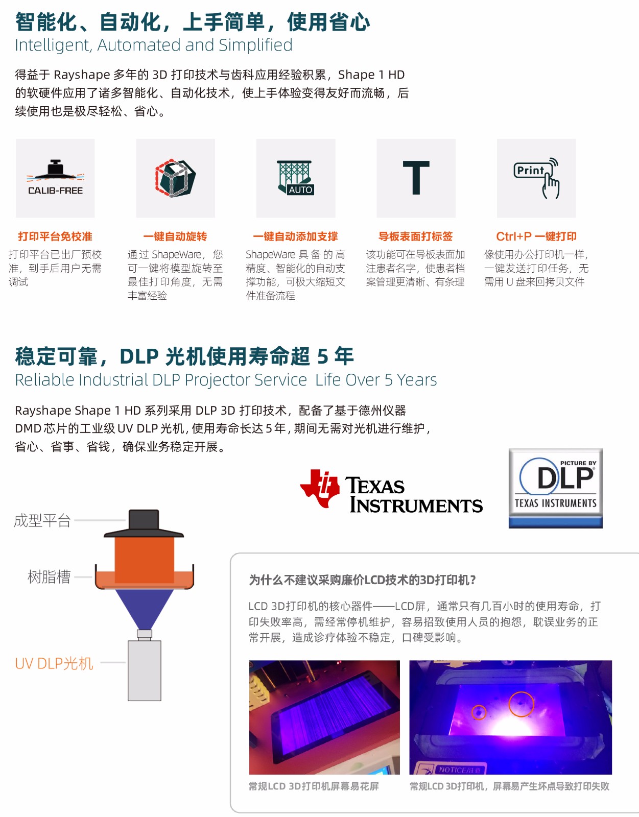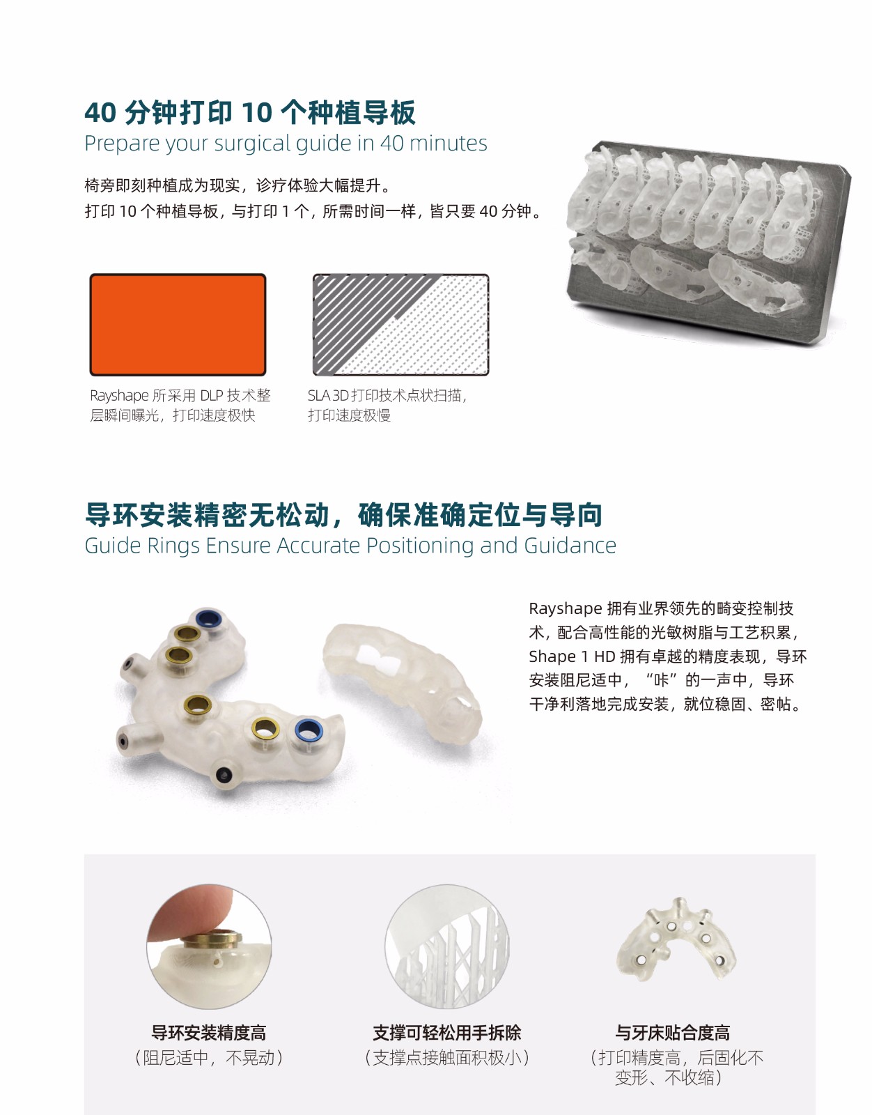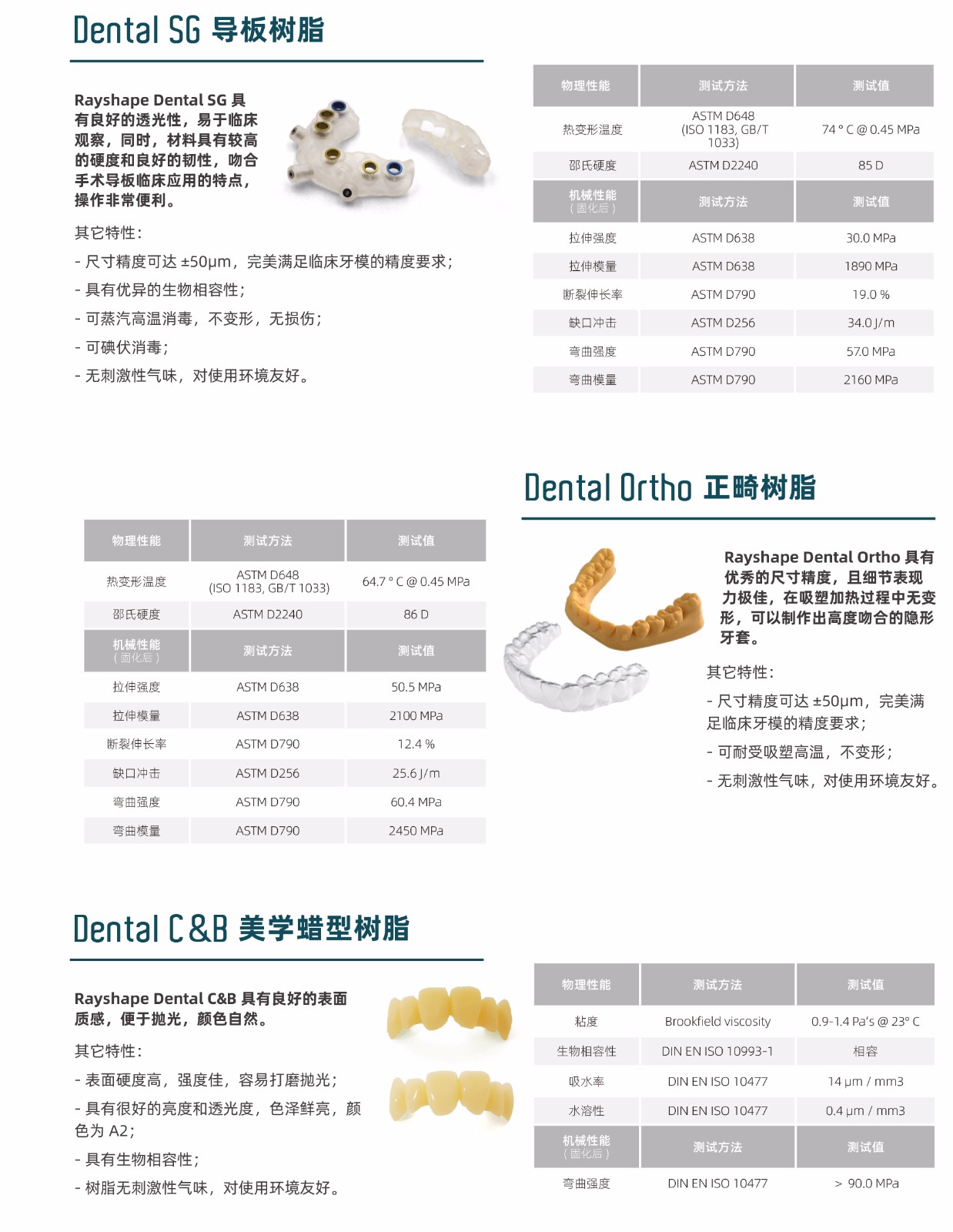 Shape 1系列3D打印機創新地將高速剝離技術與 DLP 數字面投影技術結合,使得 Shape 1 系列可以達到 50mm 高度 / 小時 * 的打印速度, 這意味著,單次同時打印多個 10cm 高的零件,最短只需要 2 小時。原廠三個系列共 20 款高性能光敏樹脂,且開放對第三方材料的支持可靠性與安全性并重辦公場景中使用的 3D 打印機產品,需要完善的設計ShapeMaterials 耗材體系涵蓋了 Basic、Functional、Dental 三個系列,可以滿足從概念原型、功能原型、模具、終端部件、醫療、文創、批產等多行業、多應用的需求。恒溫打印倉Rayshape 全系列產品皆配備恒溫打印倉技術,確保任何氣溫環境下光敏樹脂都能維持在最佳的粘度,避免因氣溫過低造成打印失敗。空氣凈化Rayshape 全系列 3D 打印機皆配備 HEPA 空氣凈化系統,降低氣味,減少光敏樹脂對工作環境的影響。安全門設計打印過程中若打開倉門,打印機會立即暫停打印,最大限度降低運動部件或激光對人造成傷害的潛在風險。Basic 系列包含標準黑、標準灰、標準白、精密、高速,共 5 款光敏樹脂Functional 系列包含韌性、剛性、耐磨、耐高溫、類硅膠、類橡膠、阻燃、防靜電、高透明、紅蠟,共 10 款光敏樹脂Dental 系列包含牙模、手術導板、正畸模、假牙齦、記存模,共 5 款光敏樹脂
